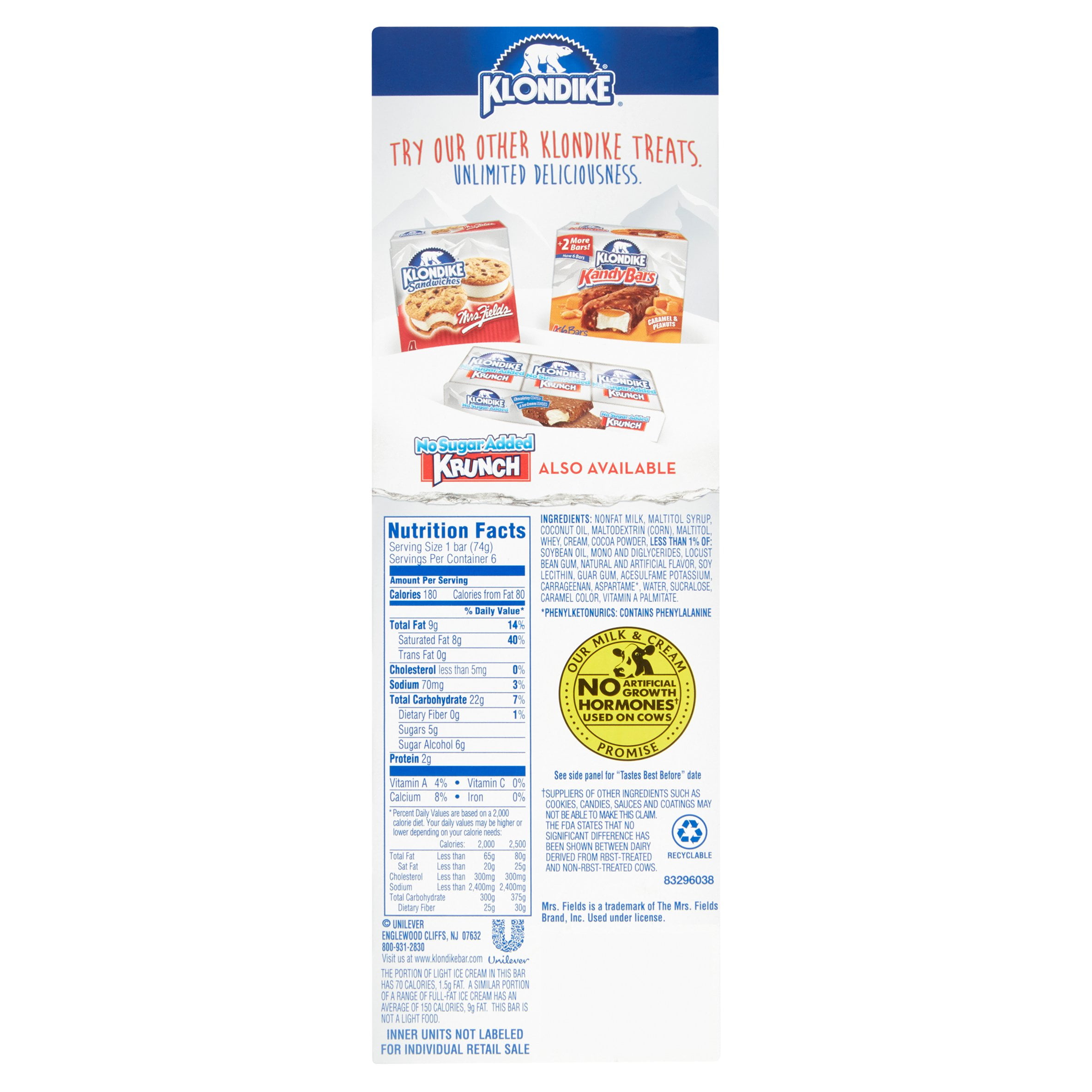 Klondike Nutrition Info & Calories May 2022 | SecretMenus The Ice Creams on the Klondike menu with the lowest amount of calories are No Sugar Added Krunch Ice Cream Bar (170 calories), Vanilla Ice Cream Sandwiches (180 calories) and Oreo Ice Cream Cookie Sandwich (200 calories). The Ice Creams on the Klondike menu with the highest amount of calories are Reese's Peanut Butter Cups Ice Cream Bar (260 ... Klondike Bar Nutrition Facts • MyFoodDiary® 250 calories. Log food: Klondike Heath Klondike Bar. 1 bar (73g) Nutrition Facts. 220 calories. Log food: Klondike No Sugar Added Vanilla Klondike Bar. 1 bar (74g) ... Klondike Oreo Klondike Bar. 1 bar (73g) Nutrition Facts. 230 calories. Log food: Klondike Mini Reese's Klondike Bar. 3 bars (117g) Nutrition Facts. 400 calories. Log food:
