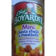 Chef Boyardee Nutrition Info & Calories May 2022 - SecretMenus Spaghetti & Meatballs Mini Beef Ravioli & Meatballs Expand Meatballs Description Jumbo Spaghetti & Meatballs Serving Size - Per 1 cup Serving Size Per 1 cup Calories 280 Total Fat 13 Carbs 29 Protein 12 Expand « Whole Grain Mini ABC's & 123'S with Meatballs Serving Size - Per 1 cup Serving Size Per 1 cup Calories 270 Total Fat 11 Carbs 33 Protein 9
