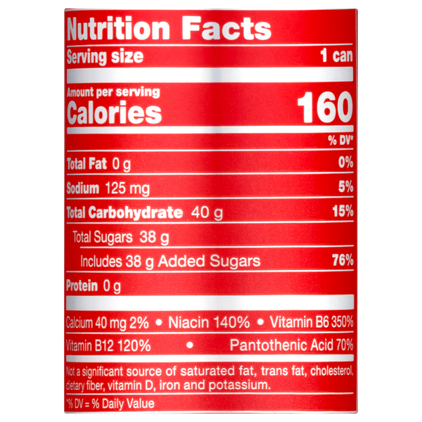 Red bull nutrition facts label. Red Bull Nutrition Facts (The Truth) - Beastly Energy Based on the nutrition facts, Red Bull has 110 calories, 0 g of total fat, 105 mg of sodium, 28 g of total carbohydrates, 27 g of sugars, less than 1 g of protein, 100% of niacin, 250% of vitamin B6, 80% of vitamin B12, and 50% of pantothenic acid. Nutrition Facts for Energy Drink Red Bull - myfooddata Energy Drink Red Bull Serving Size: × Save Food ~ = missing data Source Quick Stats Calories 111 6% DV Protein 1.2 g 2% DV Carbs 26 g 9% DV Fat 0 g 0% DV Fiber 0 g 0% DV Sugar 26 g 53% DV Where do the calories come from? 111 Calories 5% Protein 95% Carbs 0% Fat 0% Alcohol What is this food made of? 89.3% Water 0.46% Protein 10.24% Carbs 0% Fat Red Bull Energy Drink, 20 fl oz Nutrition Facts & Calories - Inlivo Contains a moderate amount of risky components that may include sodium and sugars (0.01%/oz). This item has no fiber content (0% of DV/100g). Calories in 1 Fl Oz (1.1 oz) 14 calories / 0 from fat Carbohydrates 3.3 g Proteins 0.1 g Fat 0 g Saturated Fat 0 g Calories Nutrition Risky Content Low Density (0.5 cal/g) High Density (73.2 %/cal) Calories in Red Bull Red Bull (12 oz) and Nutrition Facts Red Bull (12 oz) Nutrition Facts Serving Size 1 can (12 oz) Amount Per Serving Calories 160 % Daily Values* Total Fat 0.00g 0% Saturated Fat - Trans Fat - Cholesterol - Sodium 140mg 6% Total Carbohydrate 40.00g 15% Dietary Fiber - Sugars 39.00g Includes 3.00g Added Sugars 6% Protein 0.00g Vitamin D - Calcium - Iron - Potassium -