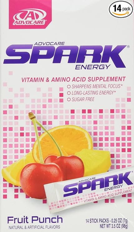 Advocare Spark Energy Drink - 14 Single Serving Packets This item: Advocare Spark Energy Drink - 14 Single Serving Packets $38.95 ($2.78/Count) Advocare Spark Energy Fruit Punch 14 stick packs $26.95 ($1.93/Count) Advocare Spark Energy Drink 14 single serve pouches - Grape - 3.5oz $24.95 ($7.13/Ounce) AdvoCare Spark Canister (Fruit Punch) 10.5 Ounce 3,026 14 offers from $53.00