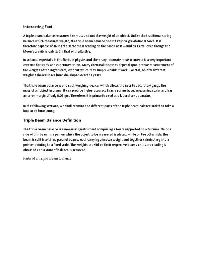 Triple Beam Balance: Function, Parts, and Uses - Science Struck The triple beam balance is a measuring instrument comprising a beam supported on a fulcrum. On one side of this beam, is a pan on which the object to be measured is placed, while on the other side, the beam is split into three parallel beams, each carrying a known weight and together culminating into a pointer pointing to a fixed scale.