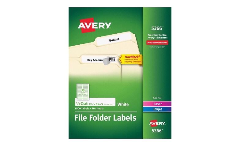 Avery 5366 Permanent File Folder Labels, TrueBlock, Inkjet/Laser, White ... The store will not work correctly in the case when cookies are disabled. ... Avery 5366 Permanent File Folder Labels, TrueBlock, Inkjet/Laser, White, 1500/Box. ... After printing, you'll have professional-looking labels that you can spot right away. This product was made using wood sourced from a certified managed forest. 8 1/2" x 11" sheets ...