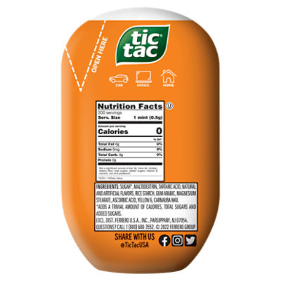 Tic Tac orange: Calories, Nutrition Facts | Calorie-Charts.info Tic Tac orange (2 pieces (1 g)) contain (s) 930 milligram (s) of sugar, 0 grams of protein, 10 milligram (s) of fat, 0 grams of fiber and 970 milligram (s) of carbohydrate.