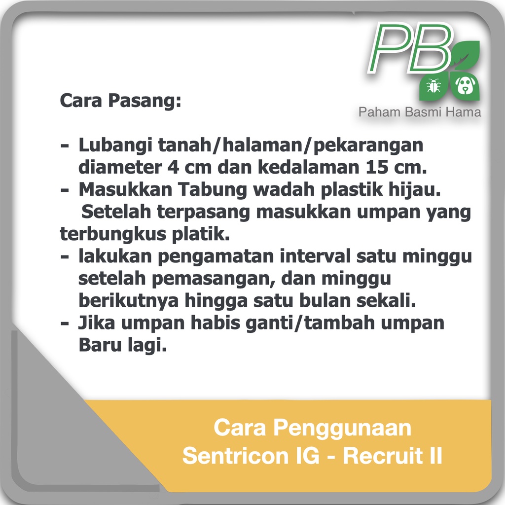 PDF Sentricon AlwaysActive Technical Manual - Total Termite & Pest Control Sentricon is available in three convenient versions:) 1 A Sentricon ready-To-Install station preloaded with a Sentricon IG Termiticide odr (i.e. Sentricon rTI station): recommended for new installations.) 2 A Sentricon two-piece IG station: recommended for use in cored concrete holes. This DOES NOT include a Sentricon IG Termiticide odr. Recruit HD Gets U.S. Patent - Sentricon The highly dense formulation is important as Recruit ® HD is the only termite bait labeled for an annual service schedule. Each Recruit HD bait contains 150 grams of bait material, more than enough to eliminate a typical termite colony. The patent for Recruit HD comes during the 20th anniversary of the Sentricon System. PDF Specimen Label - CDMS When Recruit HD is inspected and replenished per label instructions, it provides on-going prevention and elimination of termite colonies. Target sites for this system can include buildings, fences, utility poles, decking, landscape plantings and trees, or other features that could be damaged by termite feeding and foraging activity. PDF Specimen Label Read the entire label. Use only according to label ... Recruit IV was developed to be used in the Sentricon®System which represents an integrated pest management approach for the elimination of subterranean termite colonies, including Coptotermes, Reticulitermes, andHeterotermes spp. and is intended to form the basis of an on-going program providing structural protection from subterranean termites.